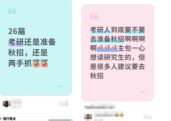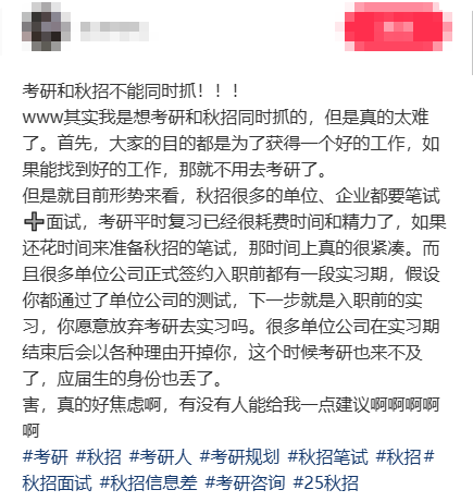 社交平台上,很多应届生都和小金有同样的烦恼。有网友发问:“考研要兼顾秋招吗?想有个工作兜底,但也很想考上研究生,秋招投了几份简历有一个进笔试了,过了的话后面还有好几轮面试,又想进面试又怕后面太耽误时间怎么办,好纠结。”